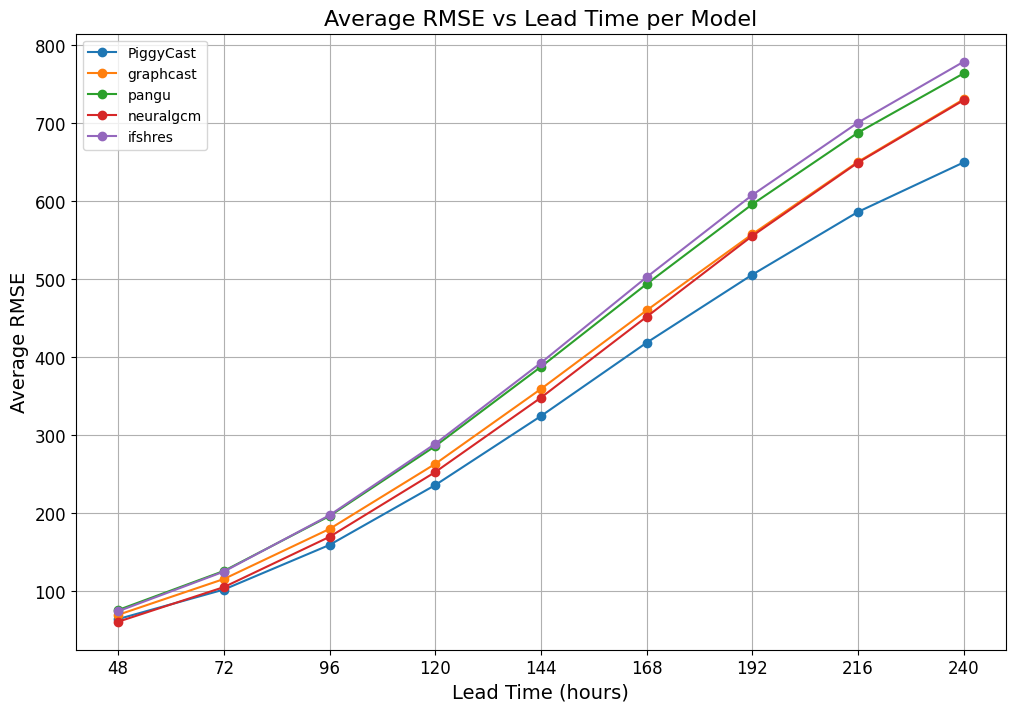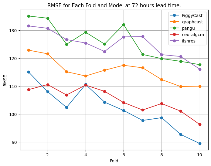 To evaluate the models' performance across 48-240 hour lead times, we calculate and plot the average RMSE across folds for each model per time lead as shown below.