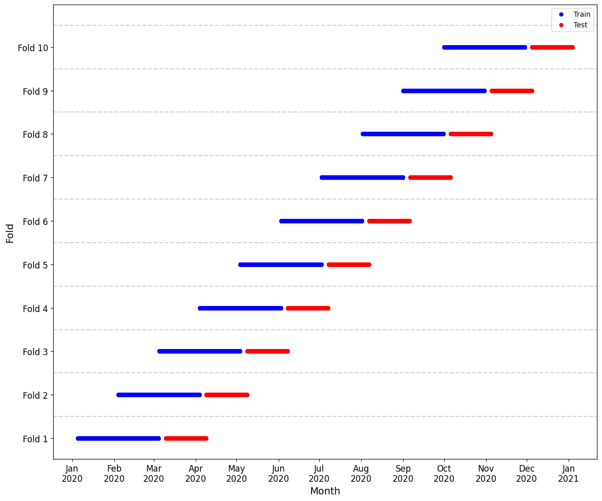 In our implementation, we use a 10-fold time series cross-validation split, with each fold comprising: