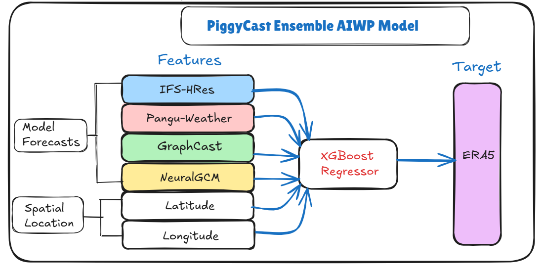 PiggyCast: Improving weather prediction skill through a stacking-based ensemble AI approach.