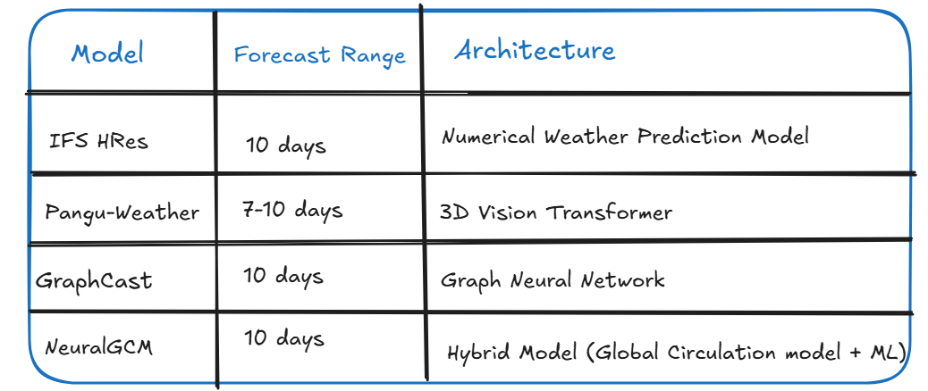 Concurrently, benchmarking initiatives like WeatherBench have standardised the evaluation of NWP, AI, and hybrid models, facilitating direct comparisons across datasets and metrics.