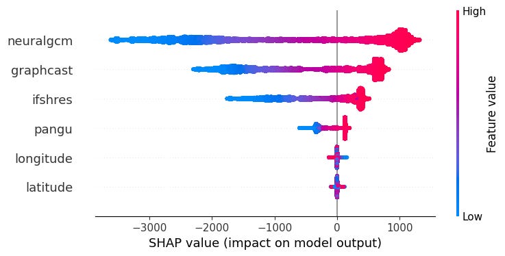 From the bee-swarm plot, we observe that NeuralGCM, GraphCast and IFS HRES greatly influence PiggyCast's decision-making at each prediction as seen with long and densely populated tails on either side of the zero divide. Pangu, longitude and latitude contribute the least to the prediction of the model, as seen with the short tails that are centred at zero.